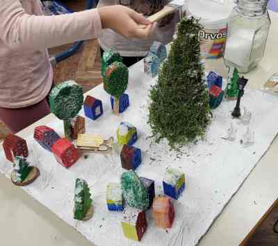 Kreativni dio radionice bio je posebno bogat i maštovit. Učenici su: bojali gipsane kućice, pažljivo oslikavajući svaki detalj, ukrašavali drveće i borove, izradili veliki bor koji su postavili u središte seoskog parka kao simbol zajedništva, na kraju, cijelo selo ukrasili sitnim lampicama koje su unijele toplinu, čaroliju i pravi blagdanski ugođaj